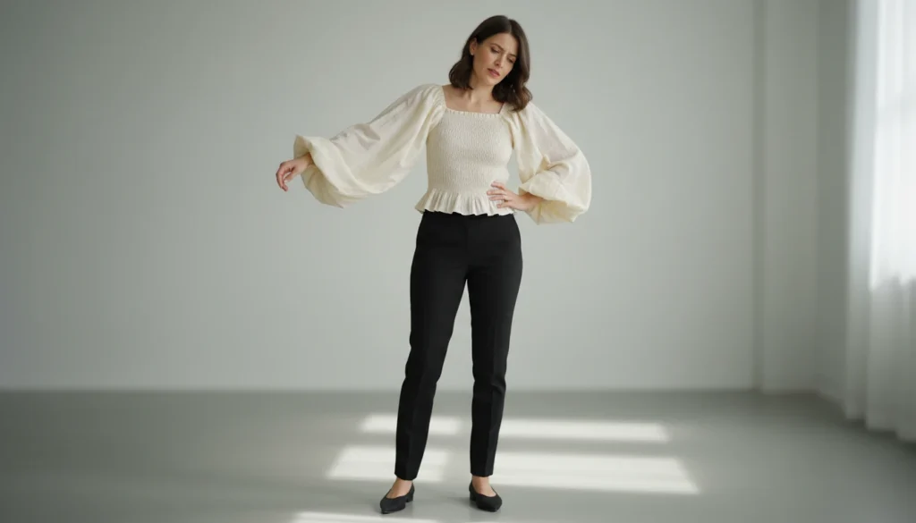 Boho puff sleeves with huge frames are flung unattractively around the arms. Not business-like enough, too business-like to be casual–not often all-in-one.
