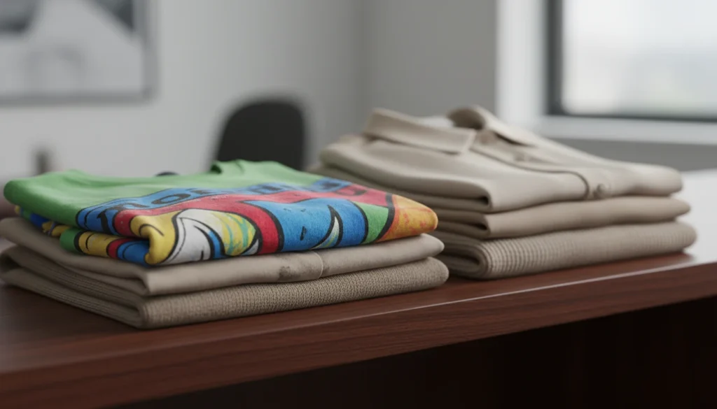 Slogan shirts or logo-covered shirts become out of fashion quickly and they look youthful in the work environment. Clothes wear out fast; they get dirty immediately after a festival.