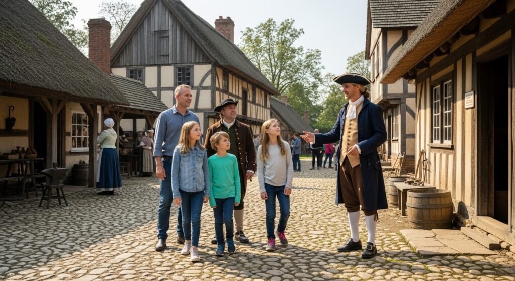 Colonial Williamsburg is a Living history site that shows reproductions of earlier periods with costumed guides and demonstrations. Families roam the entire buildings of the reconstruction and have practical activities which are both immersive and cost-effective.
