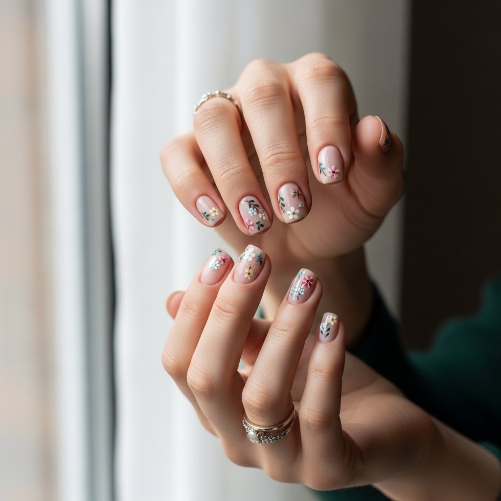 Minuscule art of floral decorates short nails. Minimal floral patterns or small hand-painted flowers make an innovative fresh and cute fashion. This design is all about personality and the general appearance is gentle and elegant.