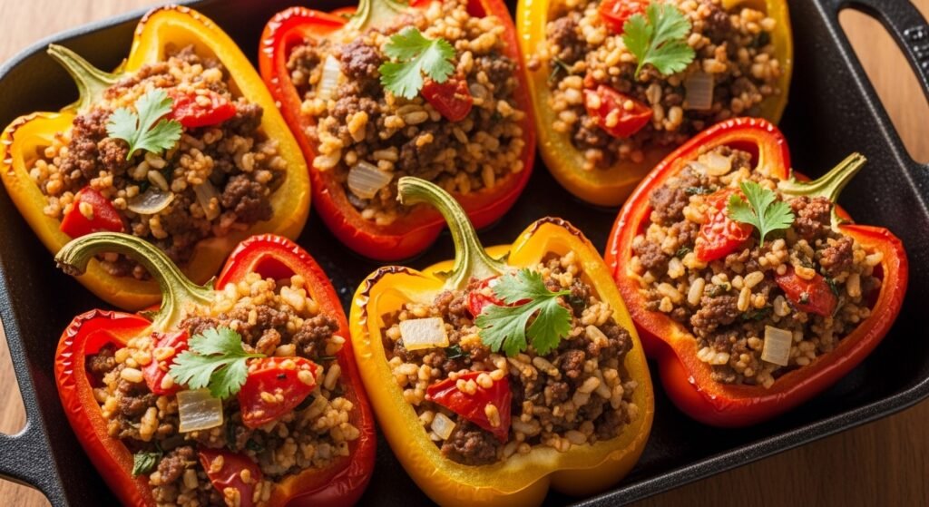 Seasoned grains are added to bell peppers with meat, and this makes a delicious and nutritious meal. They are made sweeter by baking. The meal mixes both health and the comforting element thus is a comfort meal and a balanced meal my winter meal.