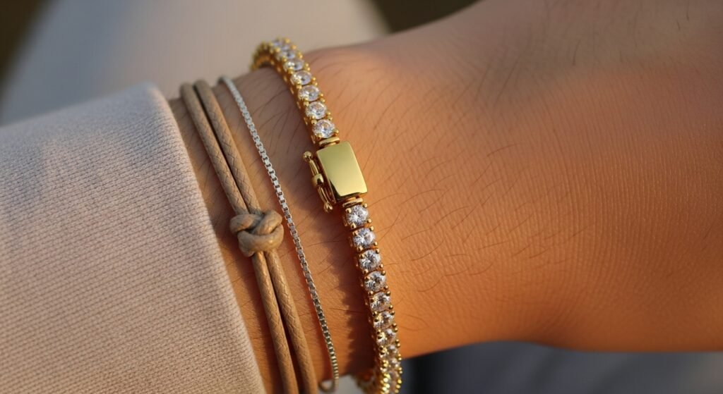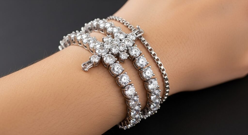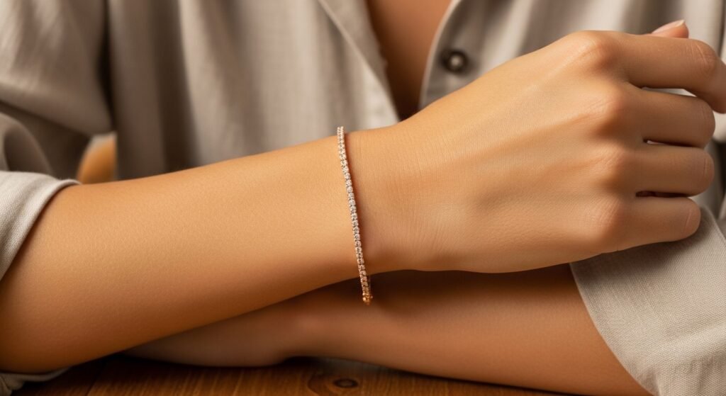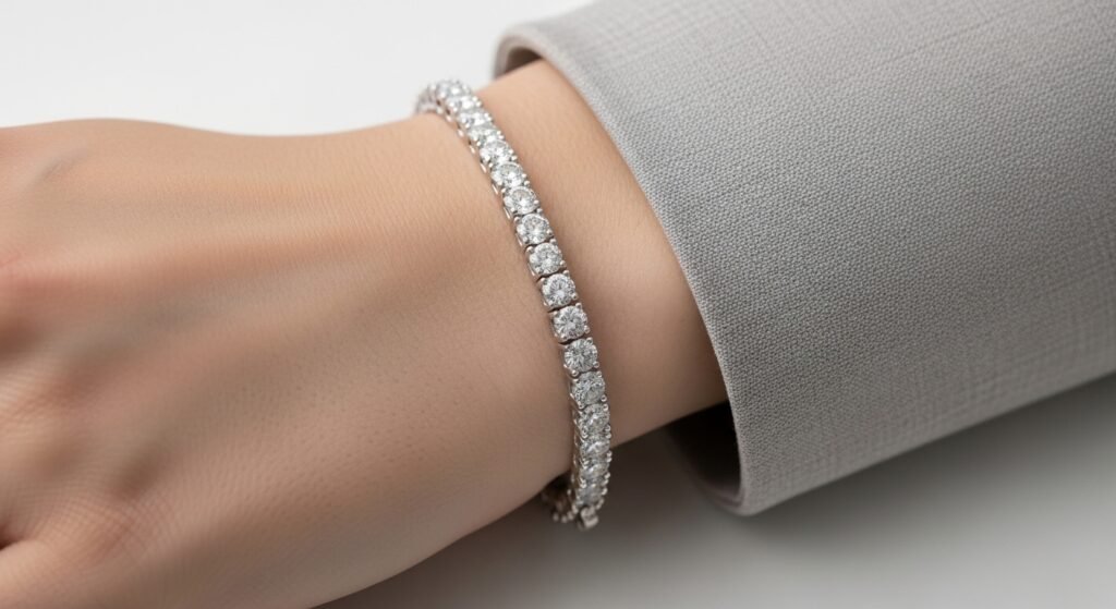 A traditional crystal line bracelet has well-spaced stones, which gently reflect light. Its style is balanced and suits off and casual wear. The sleek design is a comfortable all-day fit and does not have an incongruent relationship with watches or other layered jewelry.