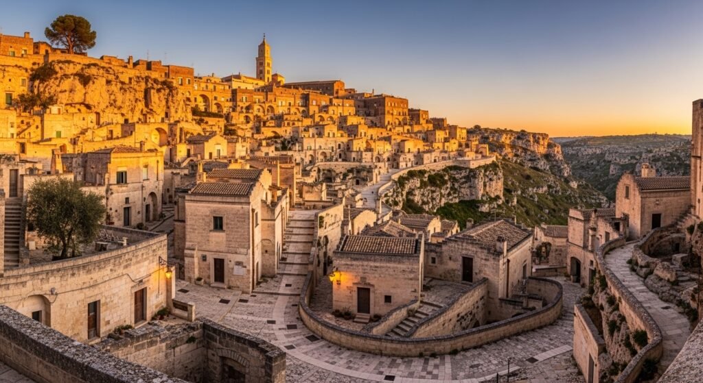 Matera is unique in that prehistoric cave houses are hewn out of limestone belts. Masoned streets are meandering between historical dwellings. The evening light makes the Sassi look like a golden landscape which is almost film-like.