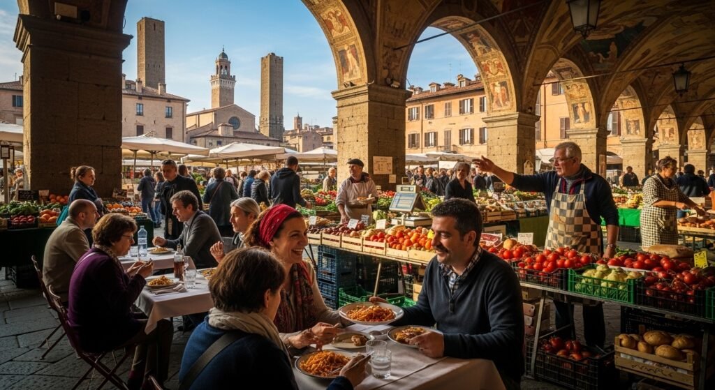 Bologna is characterised by its porticoes and culinary tradition and seems to be real and down-to-earth. Markets are busy in the morning. Old towers bend not quite but are full dictal. Evenings are associated with discussion and home-cooked meals.