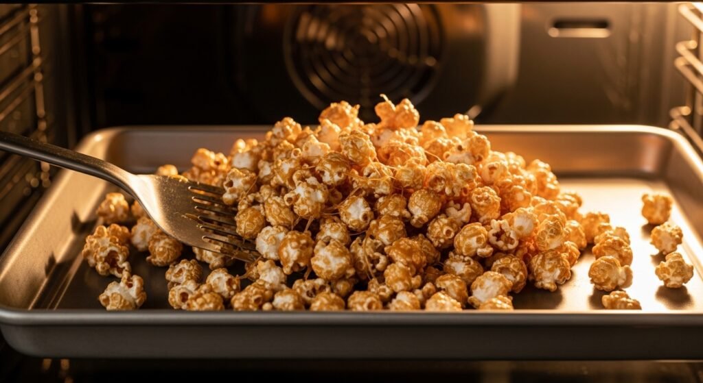 The popcorn with the coating is baked in low temperature to cure the caramel. It turns out well when stirred with occasional mixing. The outcome is a crispness that remains firm giving every bite a delightful crunch.