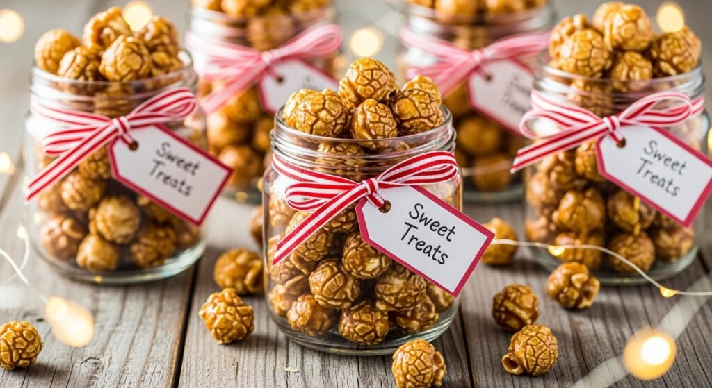 Stuff the cold popcorn in glass containers or durable paper bags. tie using a plain ribbon, and pin a handwritten note. It is made a personal, heartfelt present, soul-warming.