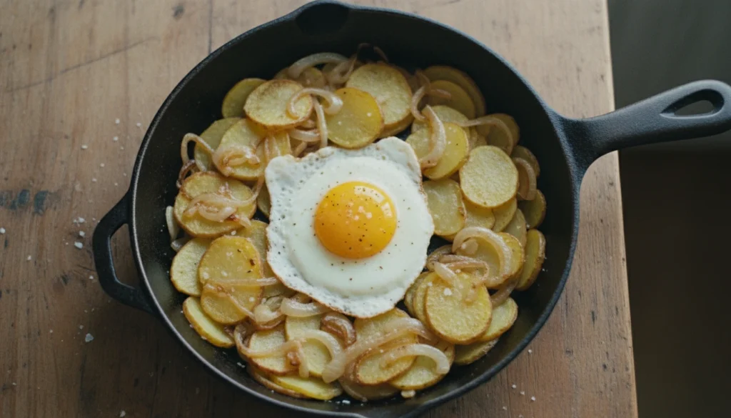 And potatoes were cheap and reliable. Thin-sliced and cooked on a skillet with onions, they became golden and crisp. A sprinkle of salt was enough. In some cases an egg was put in to give an additional comfort.