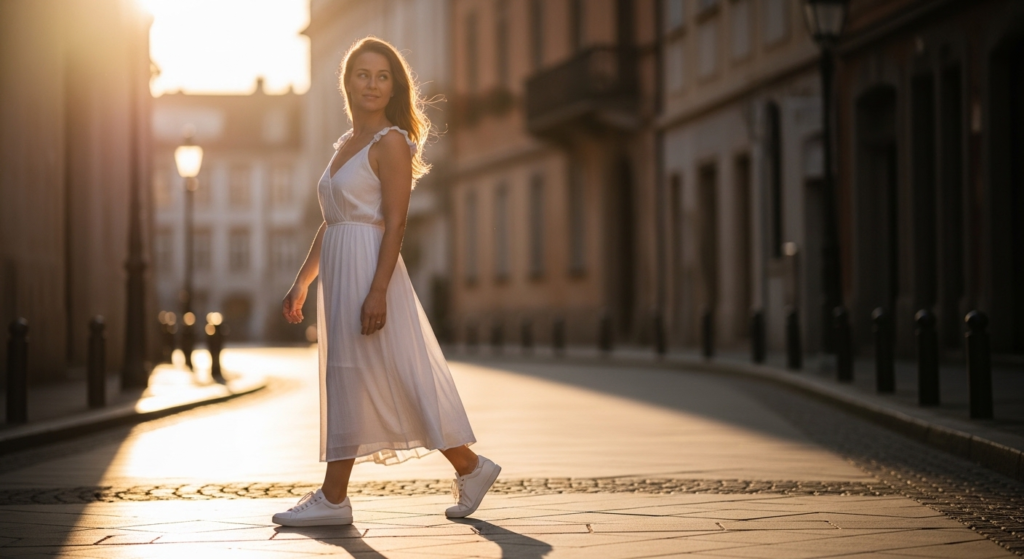 Sneakers, clean whites, and midi dresses are extremely popular at present. This is something that may be the ideal mix of being comfortably able to go out on errands and being fashionable enough to have a lunch date.