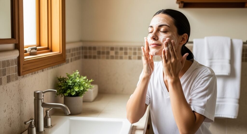 Have a light cleanser, starting your day and ending it, which gets rid of dirt without depriving the skin of moisture. Vigorous washing softens the skin barrier. Use lukewarm water and soft circular motions. Dry cloth not rubbing to avoid irritation.