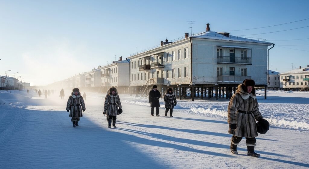 At Yakutsk, frost adheres to eyelashes in a few minutes. The constructions are constructed on permafrost, where the buildings are constructed on stilts to ensure that the heat does not melt the ground. Winters are protracted, sunny and very cold in this remote Siberian capital.