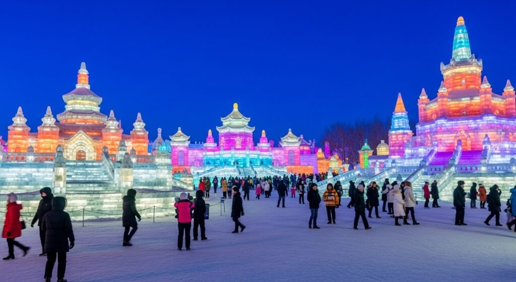 Harbin is one city that makes winter art by organizing an annual ice festival. The huge ice sculptures are illuminated upon by the night sky. Although the temperatures drop to extreme levels, people flock the area to view complex structures that are frozen.