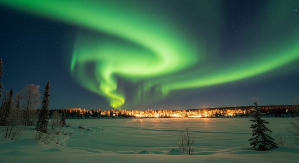The northern lights shine on the winter skies in Yellowknife. It is not very cold, but wet due to the constant dryness, and it keeps the snow for several months. People to whom the thermometer is long since below zero lean towards outdoor life.