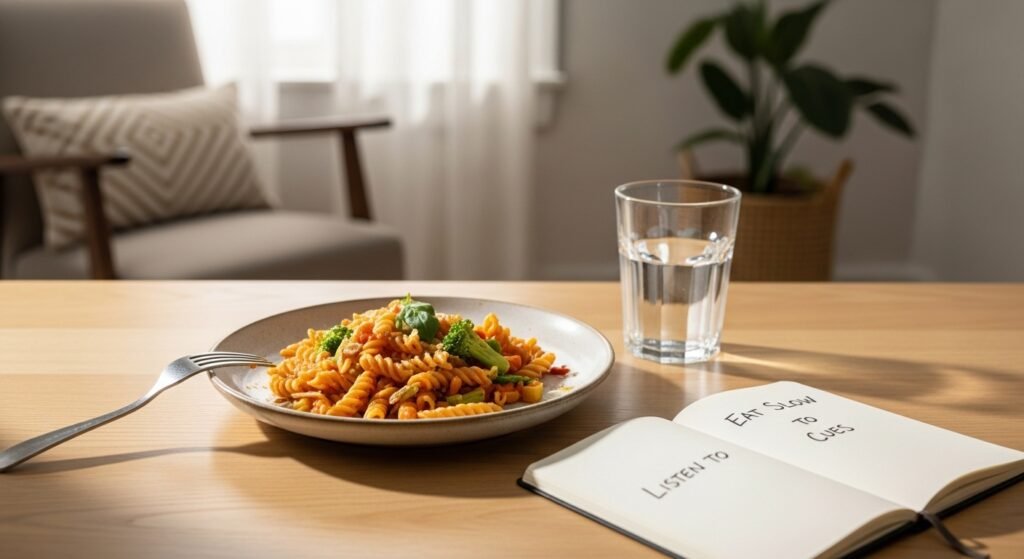 A slow pace of eating and attention to the hunger cues can help prevent feelings of upset in the digestive system. A less anxious gut may contribute to a more stable mood, though the mood is affected by a variety of intersecting factors.