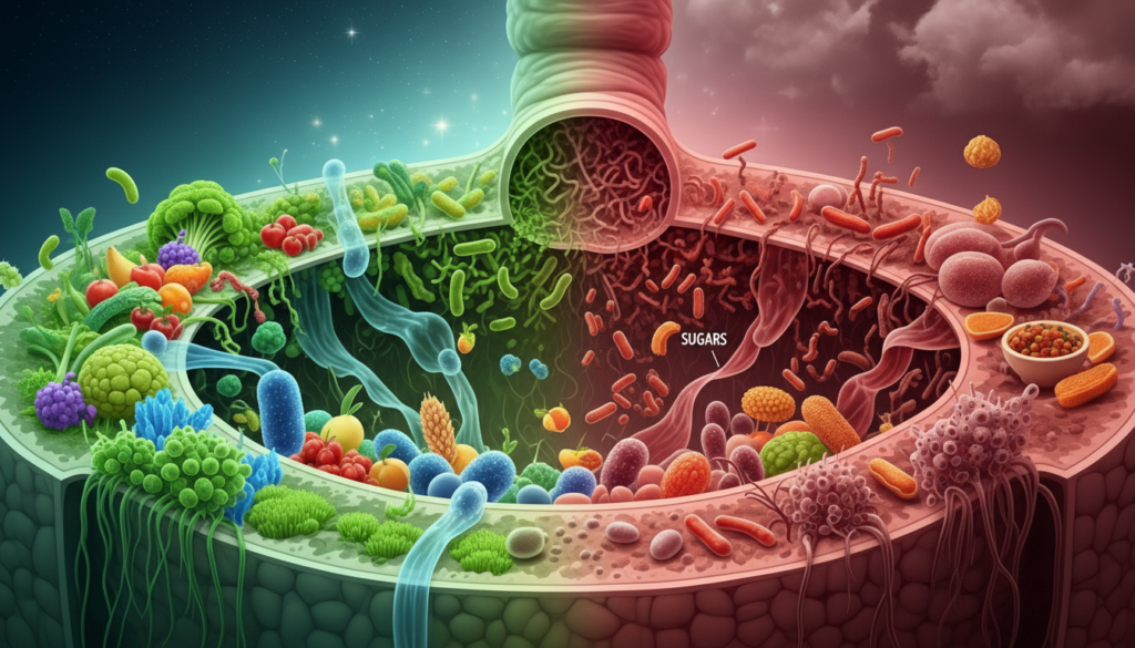 The balance of bacteria in the gut might be determined by the kinds of food eaten. Scientists are investigating the possibility of some eating habits being favorable to more stable moods, but the reaction of different individuals may be highly variable.