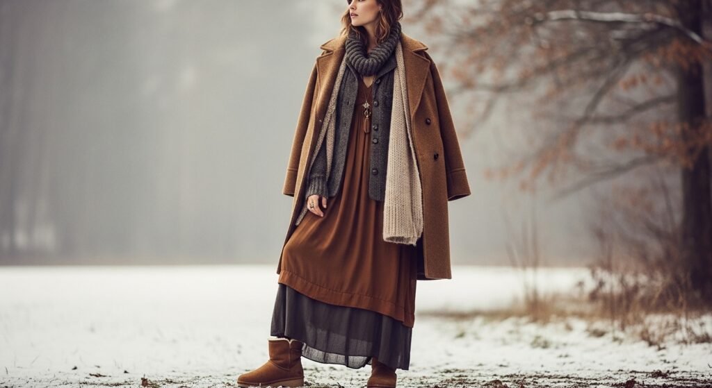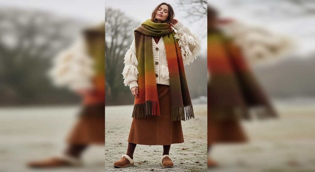 Winter boho thrives on texture, blending knits, suede, corduroy, and wool into layered outfits that feel rich and dimensional. Shearling clogs contribute another tactile element, grounding flowing skirts, oversized cardigans, and wide-leg trousers with a structured base that feels intentional rather than heavy.