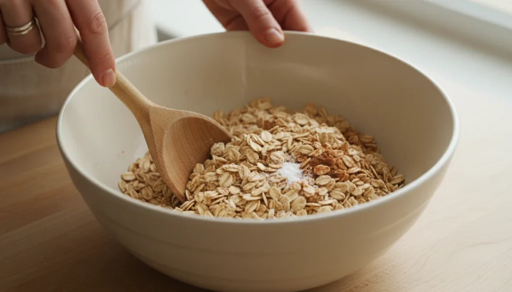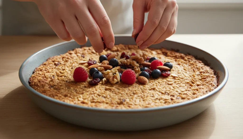 Allow the mixture to rest for a time, after which it is baked. This is achieved to enable oats to absorb liquid. The rest time improves smoothness and settling of flavour, thereby making the cooked oatmeal dish smoother and more satisfying.