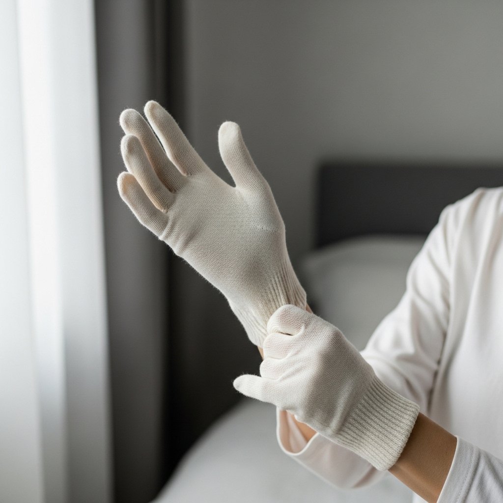 Wear cotton coverings, put cream on or put on a mask. Gloves are used to retain moisture and keep off dryness during the night. This is a simple act that enables the working better of products and the whole preservation of hands whilst you take a rest.