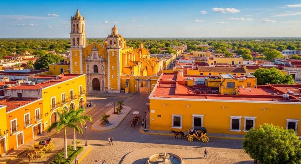 The Yellow City is also referred to as Izamal, which is bathed under the sun in Yucatán. Virtually all the buildings are covered with gold. The colossal convent is higher than the plaza. Sloodingly along sunlit avenues go horse-pulled carriages.