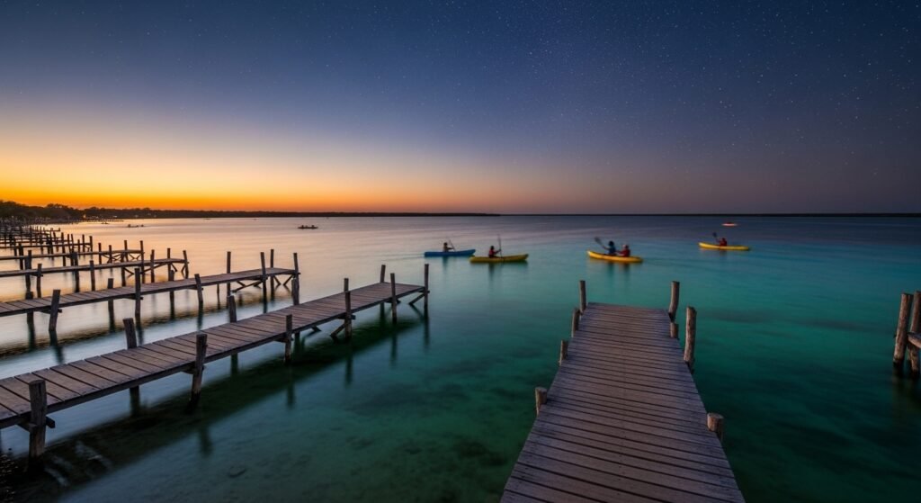 Bacalar is an area of serene waterfront along the south of a seven-colored lagoon in Quintana Roo. Docks of wood are extended in water. Kayaks glide slowly. Evenings are falling in warm breezes and starlight skies.