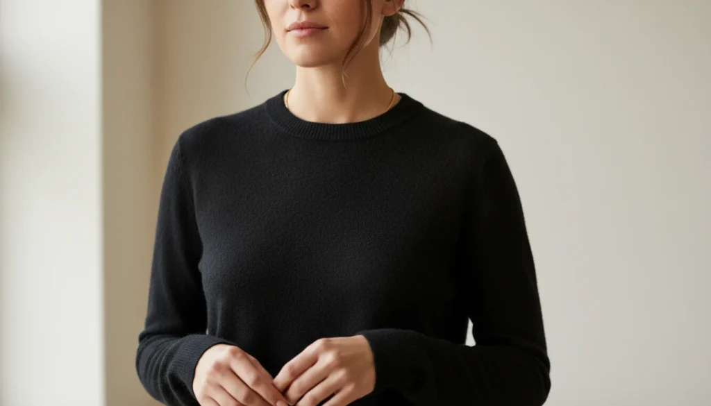 A fine knit in black, ivory, or camel layers beautifully under jackets or stands alone with trousers. Soft cashmere drapes without clinging and feels luxurious without being flashy. It works across seasons with ease.