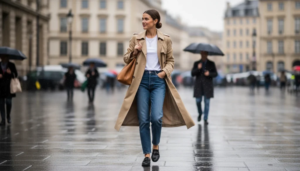 A beige or olive trench coat pulls any outfit together instantly. Wear it open over dresses or buttoned with jeans for a timeless finish. It remains a reliable outer layer in both rain and shine.