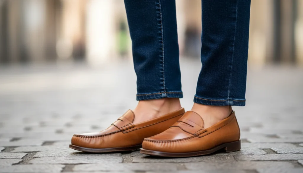 Black or tan loafers provide all-day comfort while maintaining polish. They pair equally well with tailored trousers or relaxed denim. Quality leather ages beautifully over time.