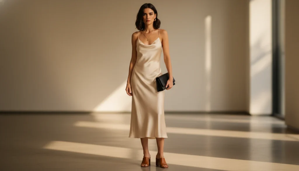 A black or champagne bias-cut slip dress glides over the body with understated elegance. Wear it solo with sandals or layer under knits and coats. Footwear easily shifts it from casual to formal.