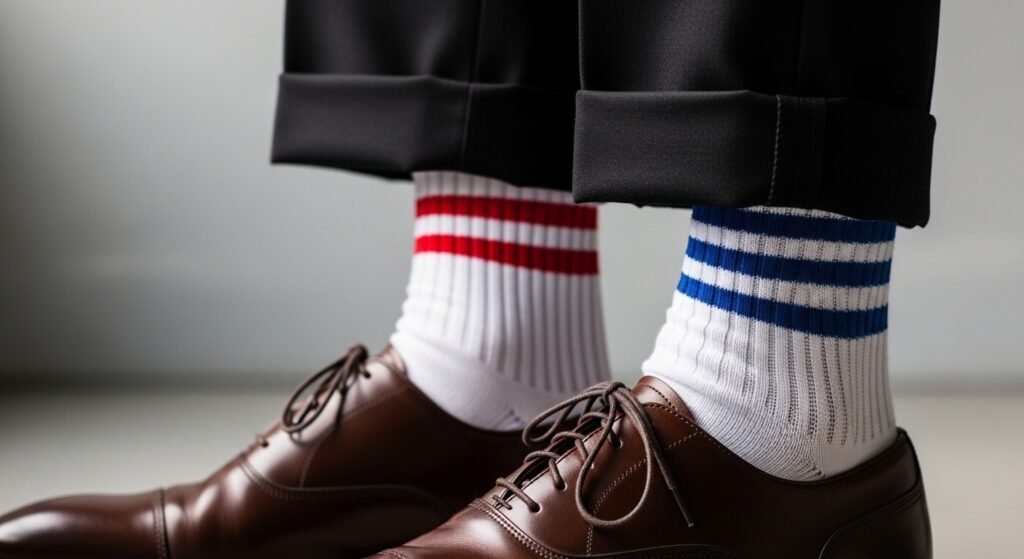 It’s a common error to wear dress shoes with sports-type white socks. Dressing up your legs with a nice leg match might work if you choose the same color as the rest of you.